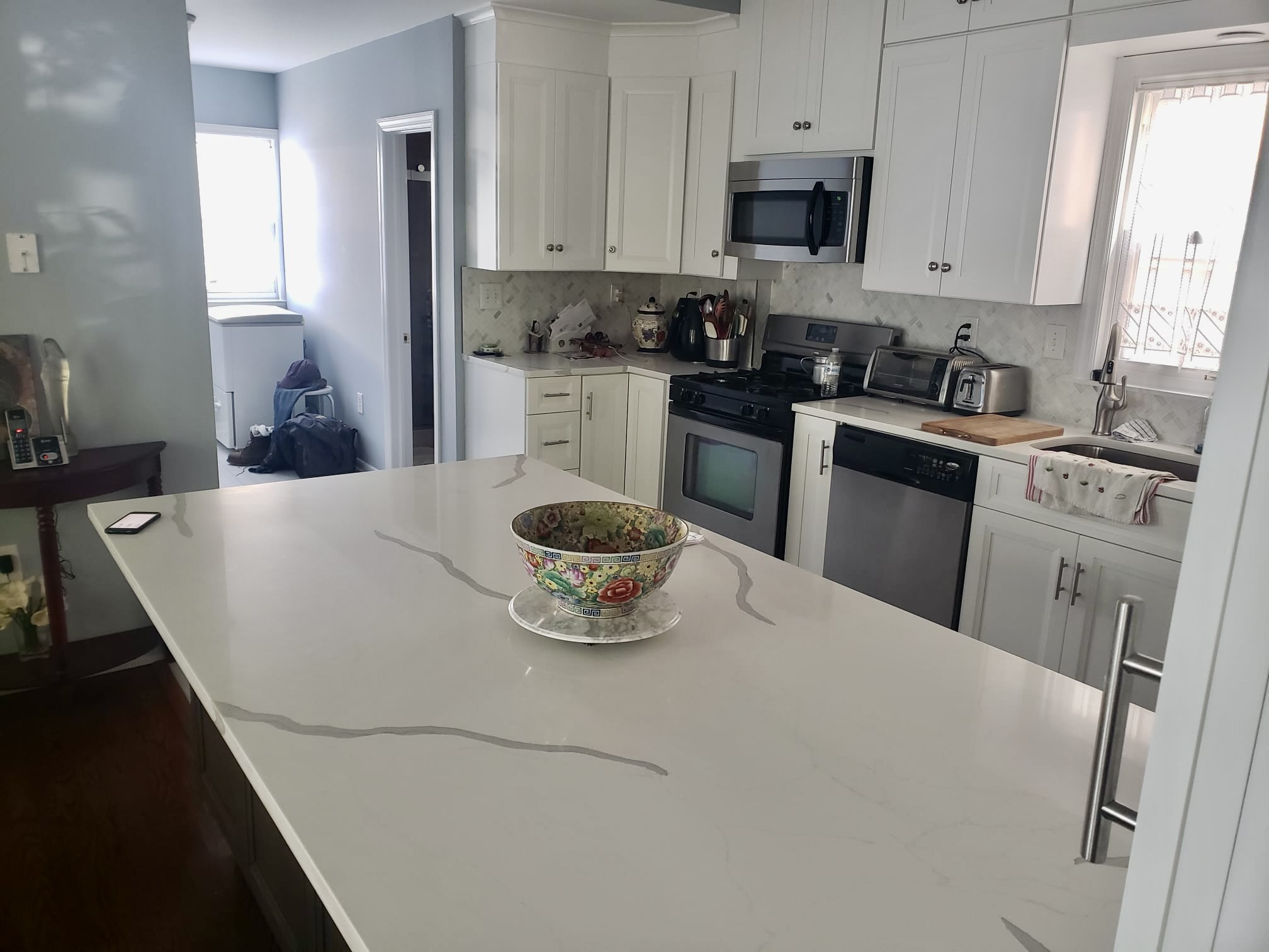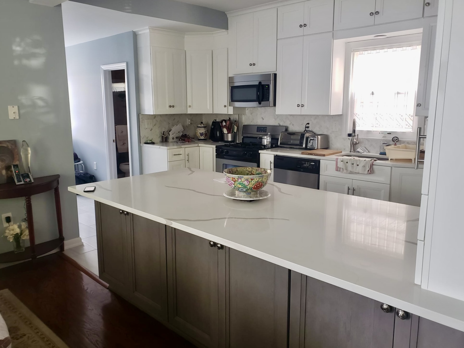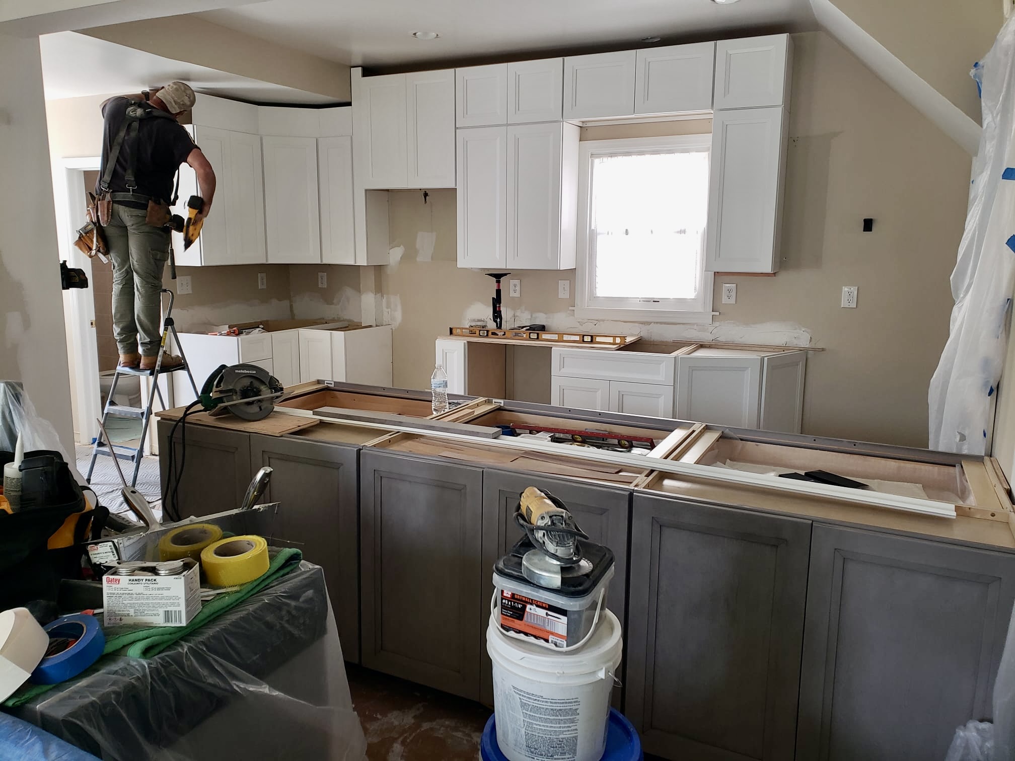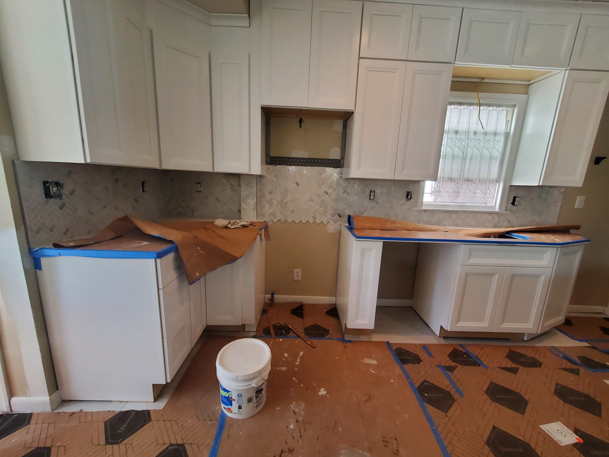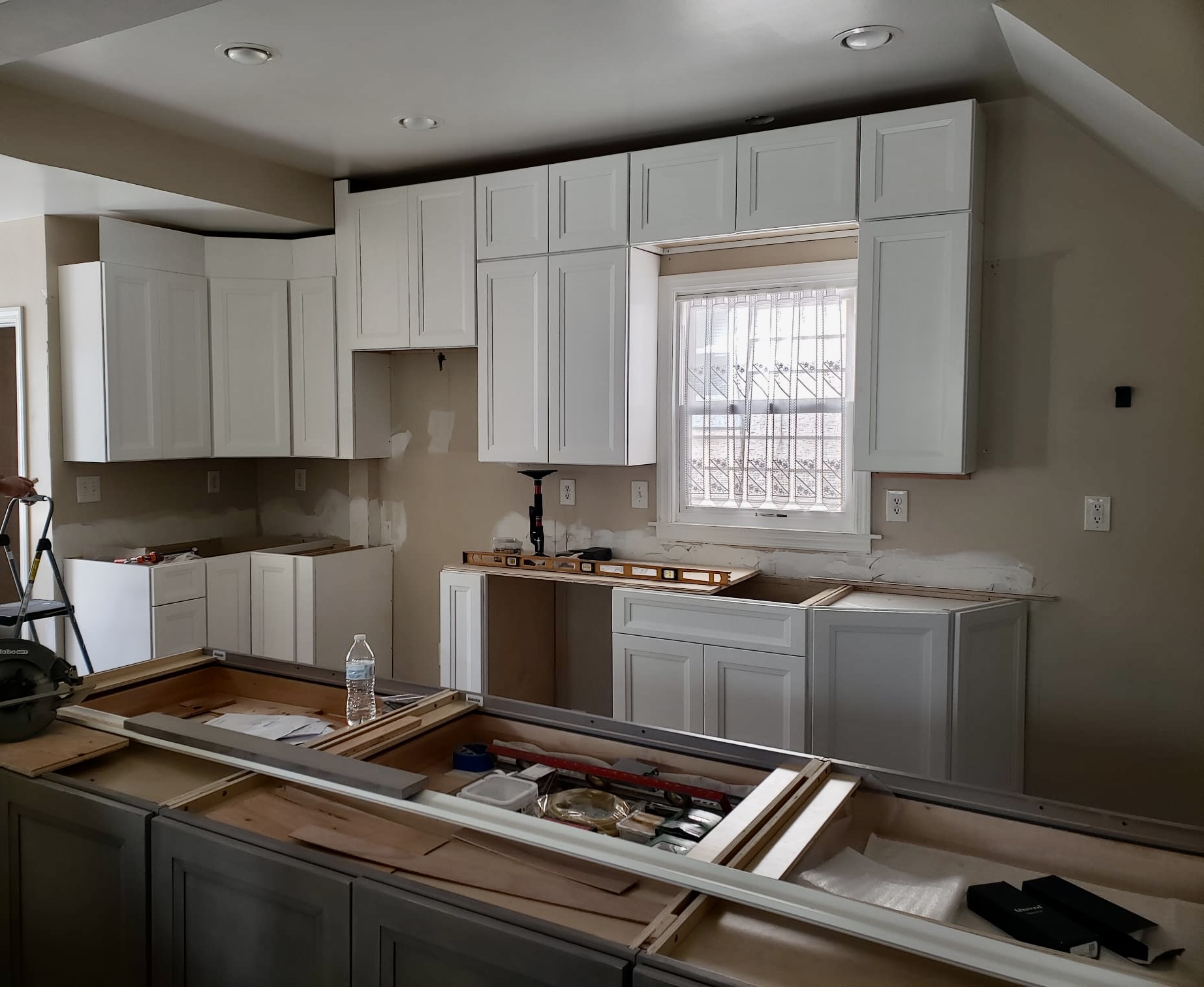 Full kitchen renovation inclusive of expanding the existing kitchen layout with full cabinet, tile, backsplash, and counter installation. Project also included a half bath remodel, with tile installation.
